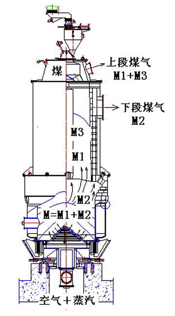 兩段式煤氣發(fā)生爐結(jié)構(gòu)如圖2示意,該爐型特點是在一段式煤氣發(fā)生爐基礎(chǔ)增加了6m左右的干餾干燥段,爐內(nèi)保持滿料層操作。兩段式煤氣發(fā)生爐的煤氣生產(chǎn)過程:作為氣化劑的空氣和水蒸汽自爐底鼓入爐內(nèi),在高溫條件下,與進入氣化段的呈半焦狀態(tài)的煤發(fā)生氧化還原反應(yīng),形成以CO和H2為主要成分的煤氣M。煤氣分兩部分向上運行,其中一部分M2通過下段煤氣夾層通道上移,最后從下段煤氣出口導(dǎo)出,該部分煤氣被稱為下段煤氣;而另一部分煤氣M1則在煤氣發(fā)生爐料層內(nèi)上行進入干餾段,通過與緩慢下移的氣化用煤直接接觸,將其熱量直接傳給氣化用煤,對煤進行干餾和干燥,同時產(chǎn)生一部分以烷烴類高熱值氣體為主的干餾煤氣M3。這部分上行煤氣及干餾過程中產(chǎn)生的干餾煤氣一起由上段煤氣出口導(dǎo)出,形成上段煤氣。