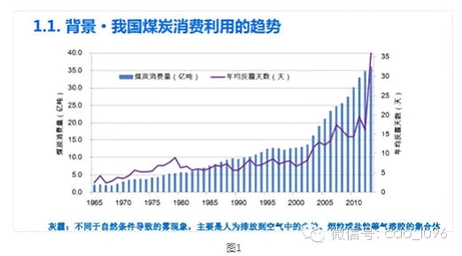 煤炭作為一種高碳高污染的能源品種,由于它價(jià)格比較低廉所以在我國(guó)的經(jīng)濟(jì)發(fā)展中起到了很重要的作用,這張圖顯示了從65年到現(xiàn)在我國(guó)煤炭利用的值,這個(gè)曲線我國(guó)平均的灰霾情況,它反映了污染的現(xiàn)象。04年以后隨著我國(guó)煤炭消費(fèi)的翻倍,霧霾天數(shù)從年均不到10天劇增到去年的36天。