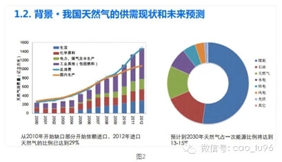 從我國(guó)天然氣的供需情況來(lái)看,需求量在不斷增加,但國(guó)內(nèi)的生產(chǎn)量卻不是那么能夠供應(yīng)商增長(zhǎng)的速度。橙色的線和藍(lán)色線之間的缺口就是進(jìn)口量,我國(guó)的進(jìn)口量到2012年比例已經(jīng)高達(dá)29%。而根據(jù)資源保護(hù)協(xié)會(huì)正在開展的煤炭資源總量控制項(xiàng)目預(yù)測(cè),到2030年的時(shí)候天然氣占一次能源的比例將達(dá)到13-15%,也差不多5200億方,這樣天然氣就會(huì)有比較大的缺口。