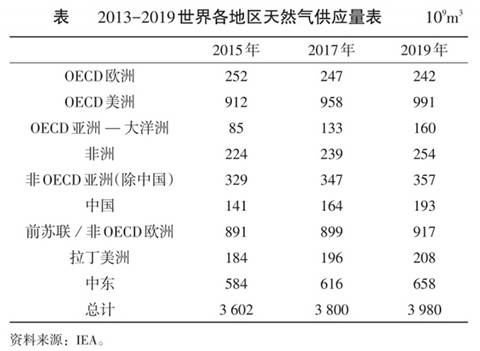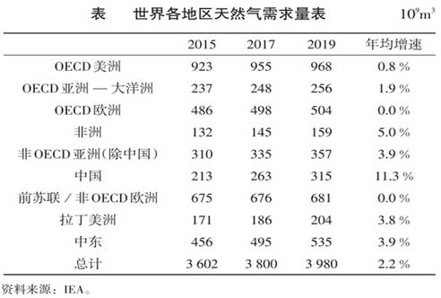 據(jù)IEA預(yù)測(cè),2020年全球天然氣需求量將超過(guò)4×1012m3。其中,2013-2019年全球天然氣需求量將以2.2%的平均年增速攀升(下表),截至2019年將達(dá)到3.98×1012m3,2020年突破4×1012m3。