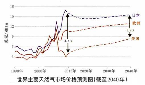預(yù)計(jì)到2020年,美國(guó)天然氣價(jià)格將上漲至(5~6)美元/MBtu,歐洲天然氣價(jià)格(10~11)美元/MBtu,日本進(jìn)口氣價(jià)格(14~15)美元/MBtu。從更長(zhǎng)期來(lái)看,全球天然氣價(jià)格呈現(xiàn)上漲趨勢(shì),原因是全球低成本氣田逐漸開(kāi)采枯竭,生產(chǎn)成本將普遍上漲。