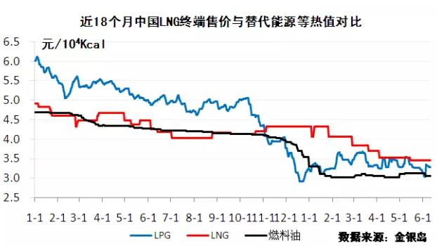 在LNG終端利用環(huán)節(jié),最具競(jìng)爭(zhēng)力的替代能源主要是LPG和燃料油。通過(guò)長(zhǎng)期監(jiān)測(cè)跟蹤終端銷售價(jià)格,將其換算成同等熱值進(jìn)行對(duì)比分析可知,自2014年11月開始,LNG相對(duì)于LPG的價(jià)格優(yōu)勢(shì)開始發(fā)生逆轉(zhuǎn),經(jīng)濟(jì)性幾近喪失,不少地區(qū)擁有燃料切換能力的下游用戶開始停用LNG轉(zhuǎn)而采用LPG作為燃料。LNG市場(chǎng)份額受到嚴(yán)重?cái)D壓。